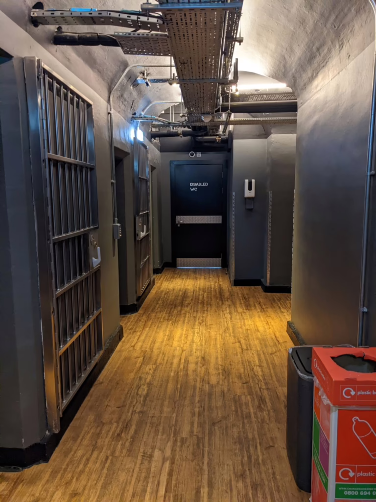 The Court is housed in an old courthouse and jail building. We stayed in a private “sleep cell” that was once a jail cell in the Edinburgh Police Chambers. The room was small, with just a bed, but there was enough open space between the door and the bed to fit our luggage without overcrowding us.